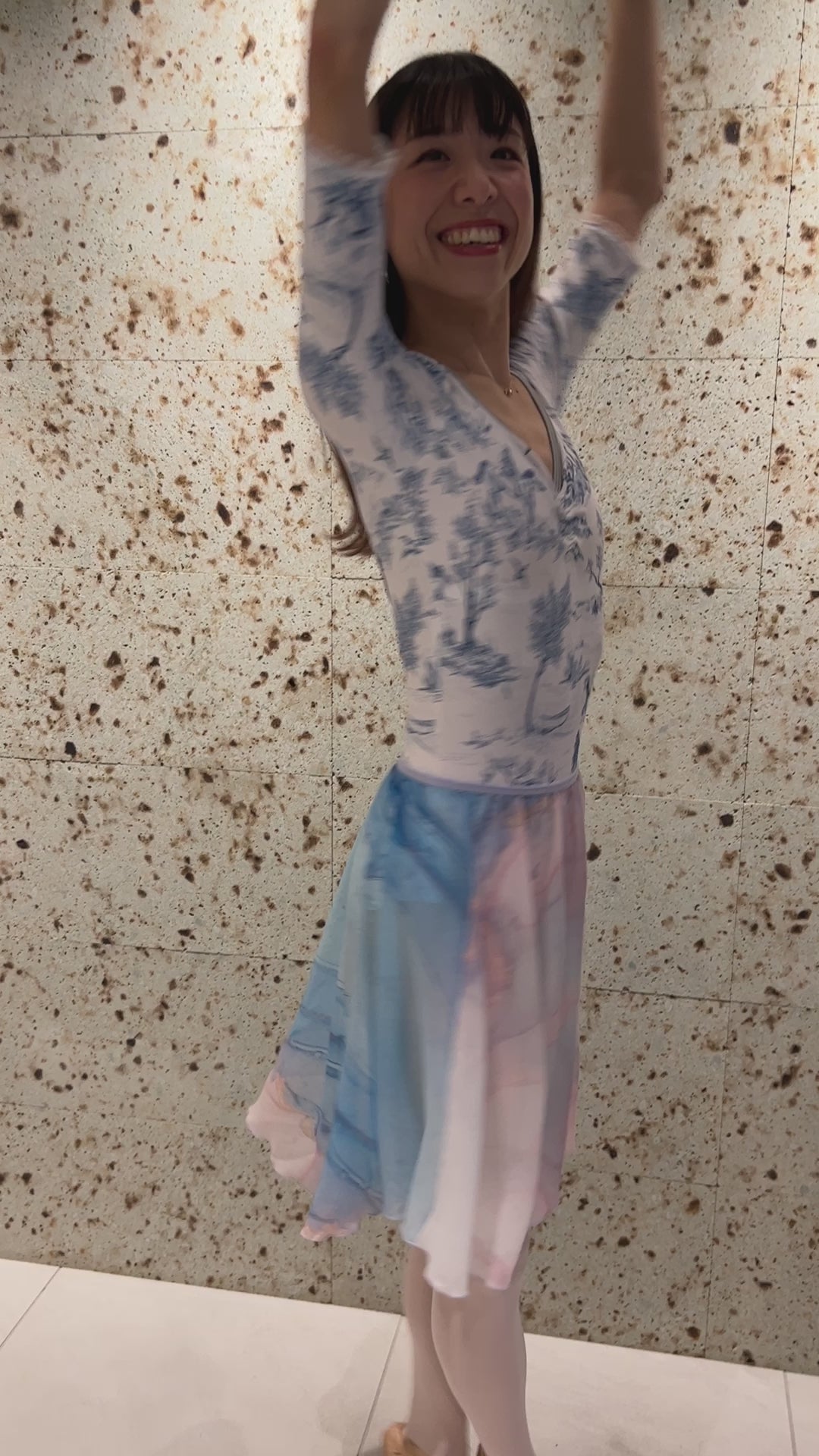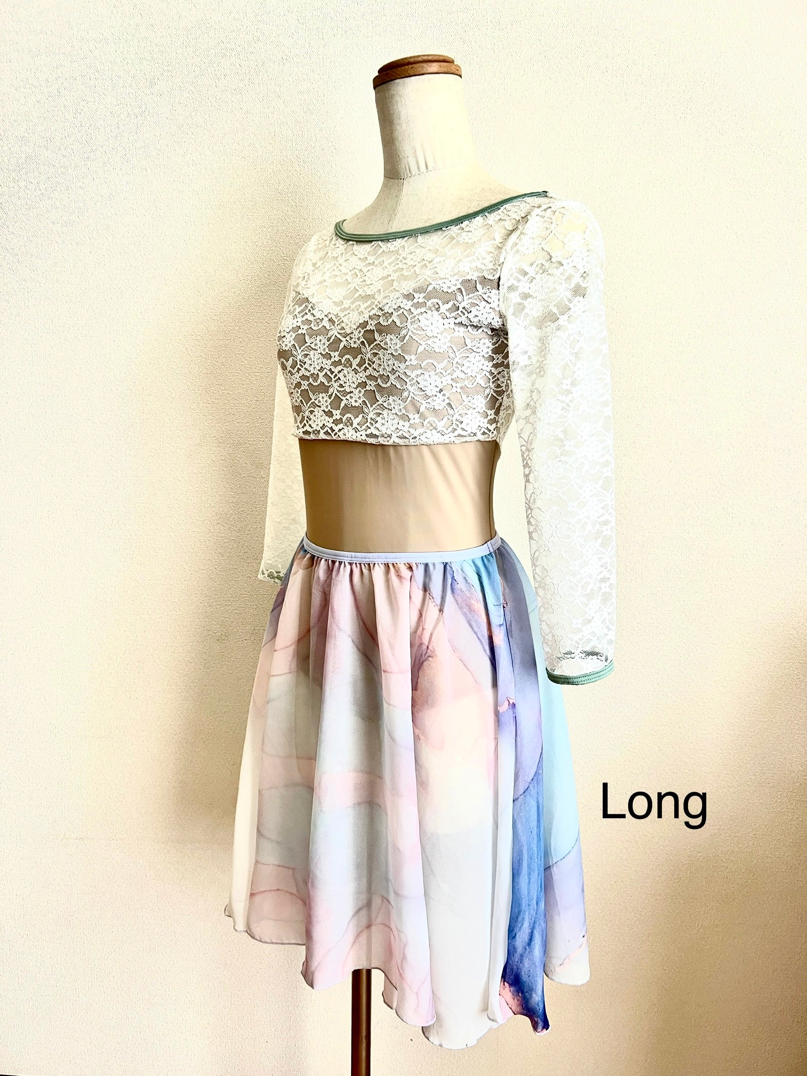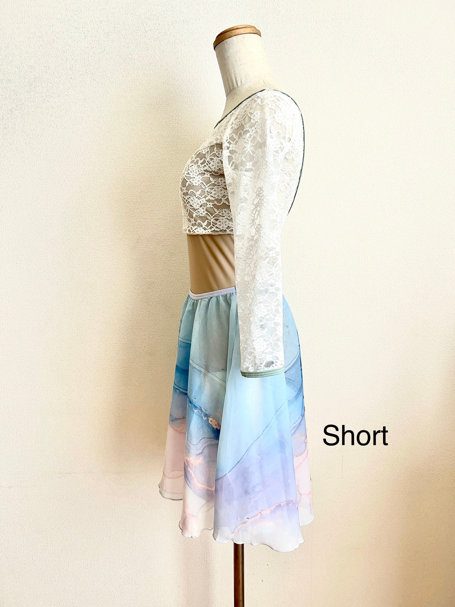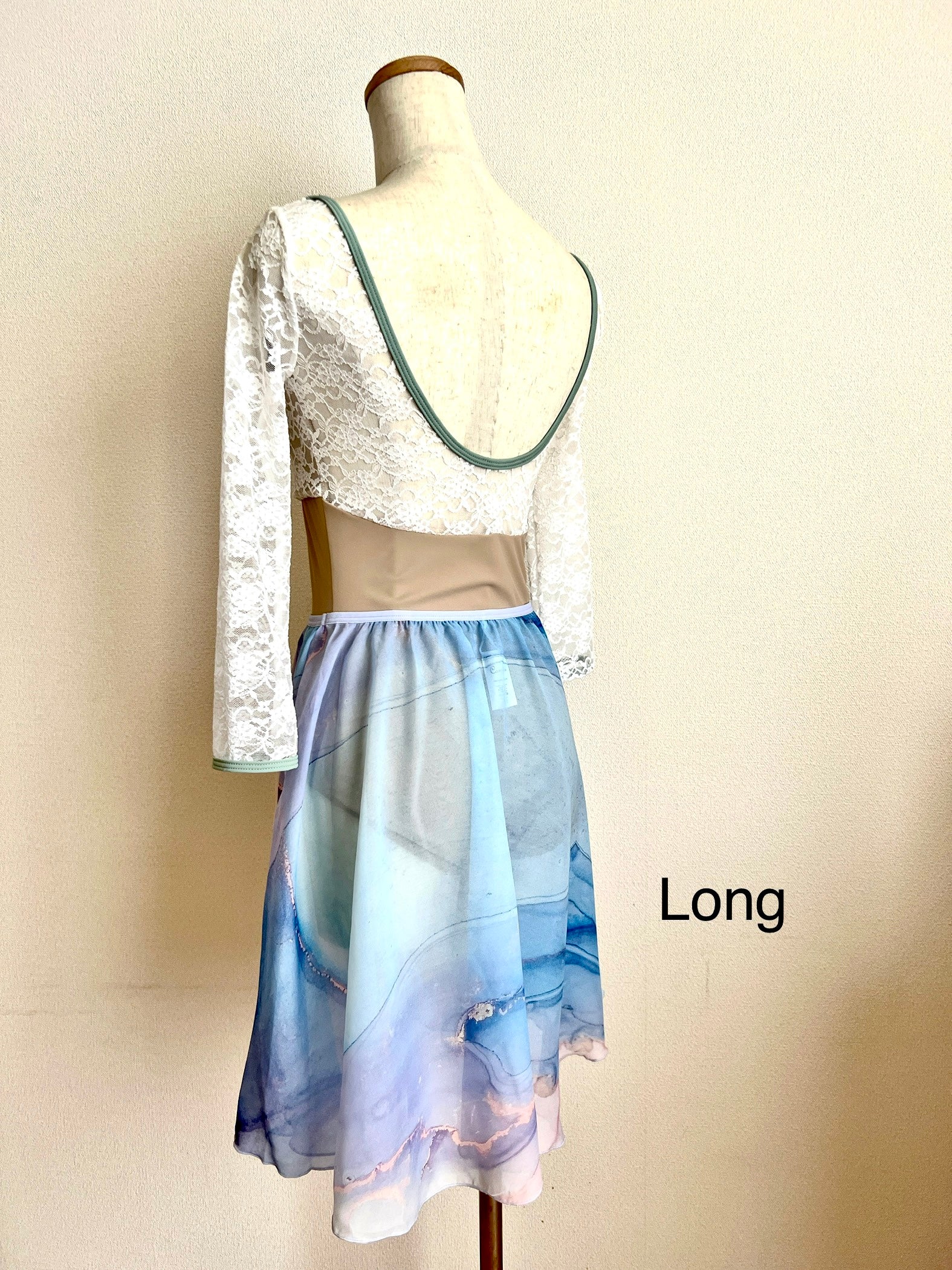 プリント位置が1点1点違うので個性的なマーブル柄のスカートです♡絶妙なカラーバランスでブルー、パープル、ホワイト、どのレオタードにも合わせてコーデ出来ます。